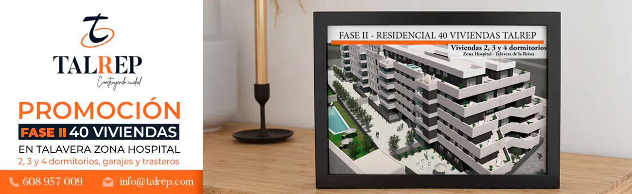 Nueva Promoción Talrep de 16 viviendas de 3 y 4 dormitorios en Talavera de la Reina. Calidad, servicios, confort y bienestar. Edificio con gran luminosidad y elegancia. Financiación a medida y facilidades de pago. Pide información sin compromiso a través de nuestro teléfono 608957009.